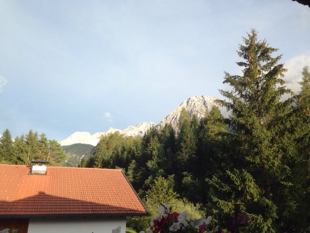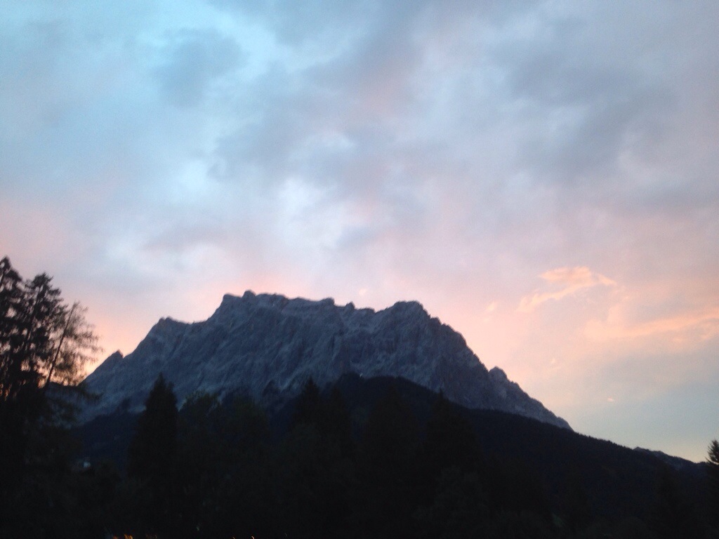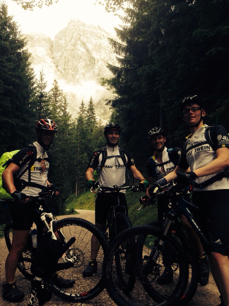 Auf dem Radweg Richtung Grainau konnten wir gemütlich einrollen bevor es in Hammersbach auf einem kleinen Uphill Waldweg 350 hm zum Eibseeufer ging…danach schraubten wir uns in bereits sportlichem Tempo angeführt von unserem Pacemaker Omo zur Hohen Töhrle Hütte auf 1500m üNN! Aufgrund der fortgeschrittenen Abendstunde ging es ohne Pause direkt über verschiedene fahrbare und auch nicht fahrbare Trails zur Talstation der Tiroler Zugspitzbahn! Ab dort begann der Spaß mit einem Flowtrail der ersten Kategorie…glücklich konnten wir die erste Kurzetappe mit 26km und 880hm vor Einbruch der Dunkelheit beenden! In Ehrwald wurden wir freundlich von Edith vom Haus Edith mit den Worten:“jetzt duscht’s erst mal heiß und dann geht ihr was essen“ oder „Herr Sum (verschwitzt), jetzt ziehen sich aber mal was über“ mütterlich begrüßt!