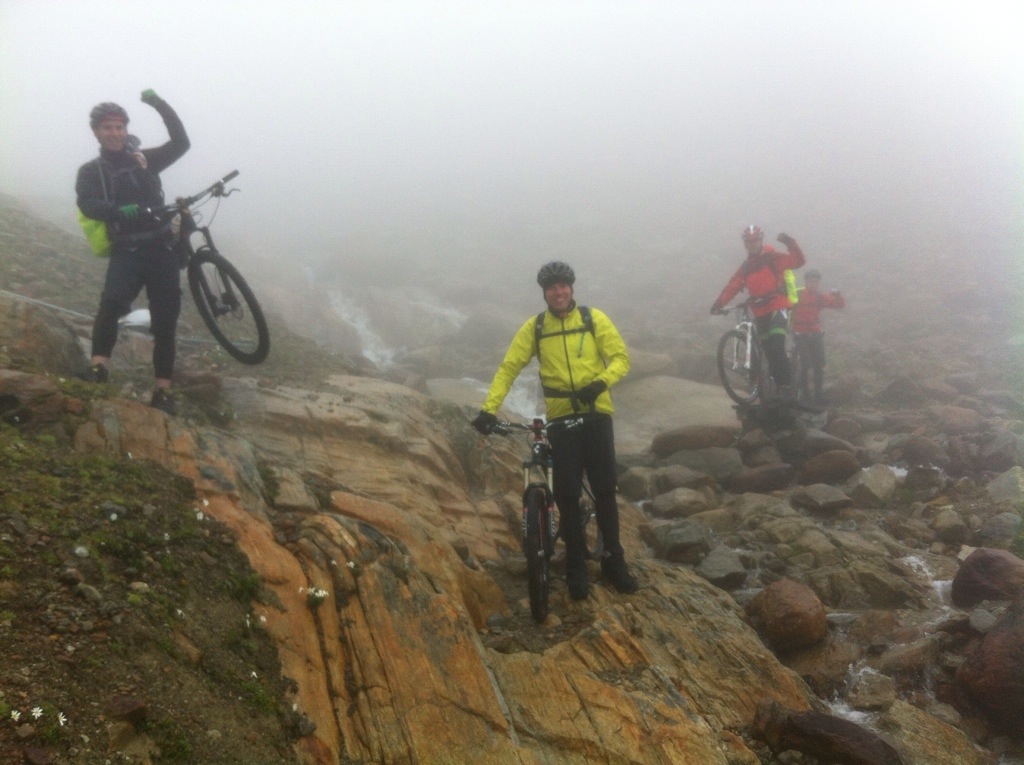Nach ein paar steilen Straßenkilometern saßen wir bei Holunderschorle und Speckknödelsuppe im Gasthaus Sonnblick. Anschließend machten wir uns auf zum Tiefenbachgletscher. Ungefähr 3 Km vor dem Gletscher begann es stark zu regnen und wir wurden bei 7,6 Grad unfreundlich vom Gletscher empfangen. Nach der Fahrt durch den Rosi-Mittermaier-Tunnel (1,7 Km, 200 hm) wurden wir vom Tiefenbachgletscher bei Regen und 4,8 Grad empfangen. Wir entschieden uns Beinlinge , Armlinge oder langes Radshirt zusätzlich anzuziehen.